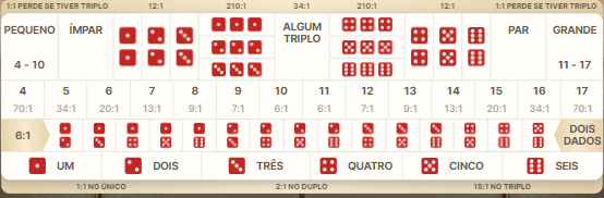 Aposte no total dos três dados, podendo ser um número Ímpar ou Par. Essas apostas perdem para resultados de qualquer triplo.