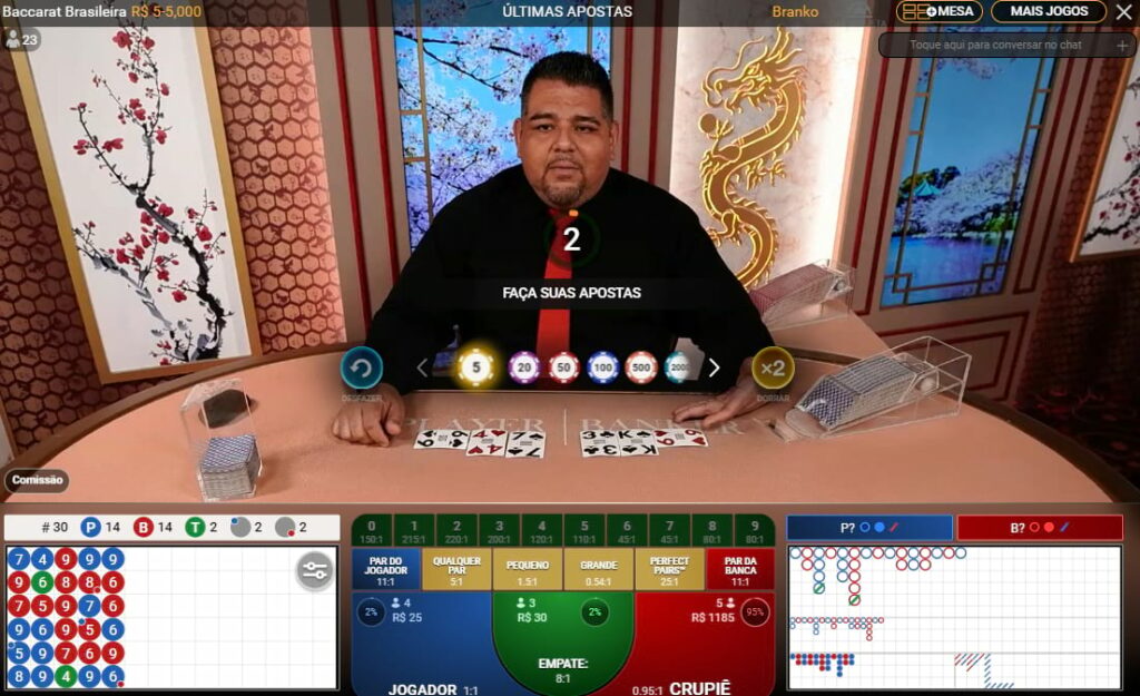 Baccarat Brasileira é um jogo de cassino ao vivo de baccarat jogado com 8 baralhos e guiado por um croupier ao vivo, onde você disputa contra as cartas da banca. Para ganhar, o objetivo é acertar qual mão entre jogador e banca será a chegará mais perto de 9 e será a vencedora da rodada, ou se será empate.