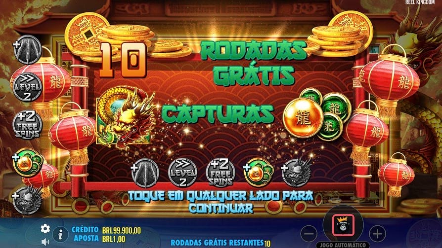 Durante os giros grátis, os símbolos Wild (dragões) coletam os valores dos símbolos de dinheiro (esferas de dragão) e podem desbloquear multiplicadores e giros extras.