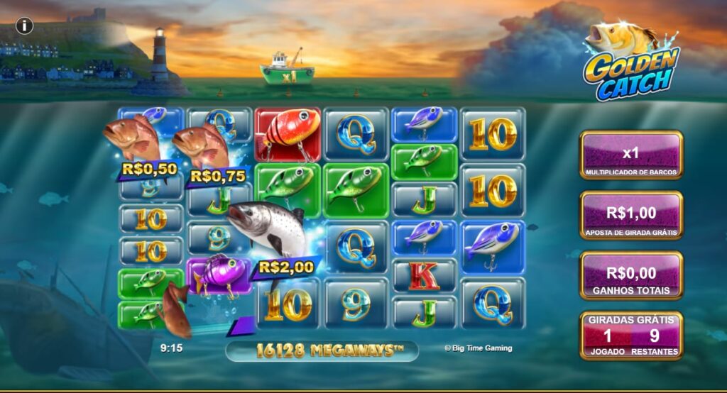 Golden Catch é um jogo de slot com tema de pesca, onde os jogadores embarcam em uma aventura marítima em busca de grandes capturas e prêmios. Elementos que remetem à vida no mar, como barcos de pesca e peixes coloridos estão presentes, com vários recursos, como a queda de símbolos com a mecânica megaways.