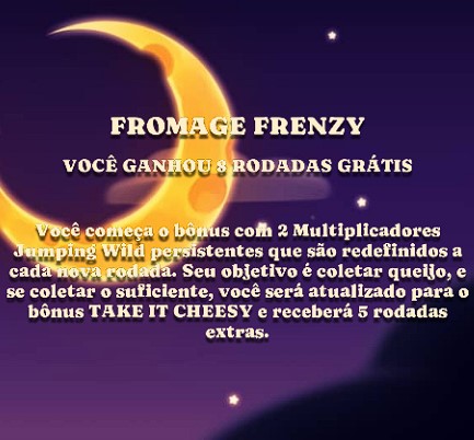 - Fromage Frenzy: bônus com 2 multiplicadores Wilds Saltitantes garantidos por 50x a sua aposta.