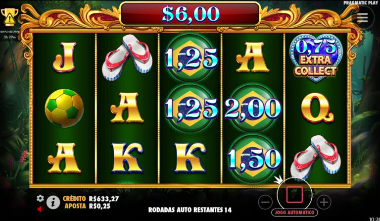 - Símbolo de Dinheiro: O símbolo de dinheiro aparece como bandeiras brasileiras nas bobinas 1, 2, 3 e 4, exibindo valores em dinheiro aleatórios. Quando combinado com um símbolo de coleta na bobina 5, esses valores são somados e pagos a você.