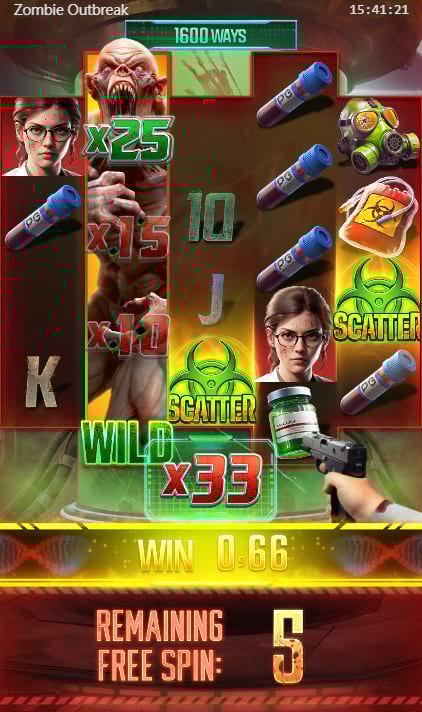 Zombie Outbreak apresenta 13 símbolos, como cartas de baralho, amostra de sangue, um composto medicinal em frasco verde, máscara de proteção contra gases, bolsa de sangue e uma cientista, além do Scatter de risco biológico e o Wild. Você ganha revelando no mínimo 3 símbolos iguais nas bobinas.