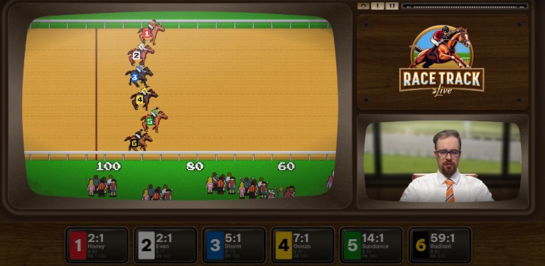 Race Track é um jogo de cassino ao vivo que simula uma corrida de cavalos. É isso mesmo! O objetivo aqui é prever qual competidor terminará a corrida em primeiro lugar.