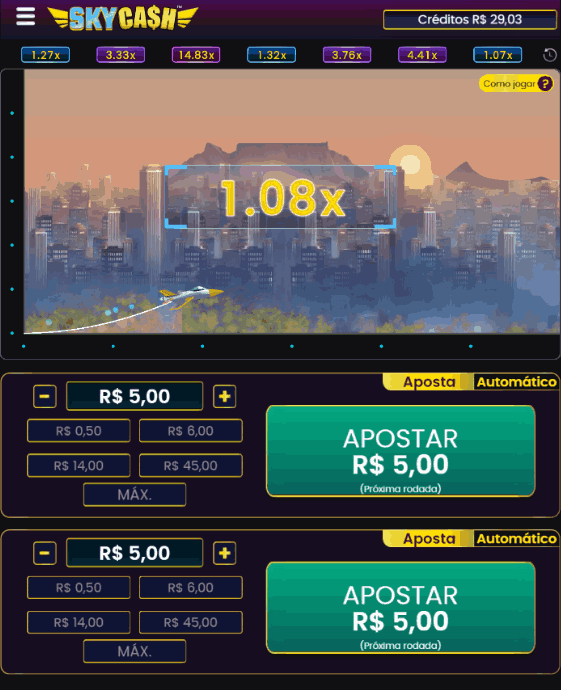 A interface do jogo Sky Cash é bem simples e fácil de usar. Logo na tela inicial, você encontra os dois quadros de aposta, onde pode configurar valores diferentes para cada rodada.
