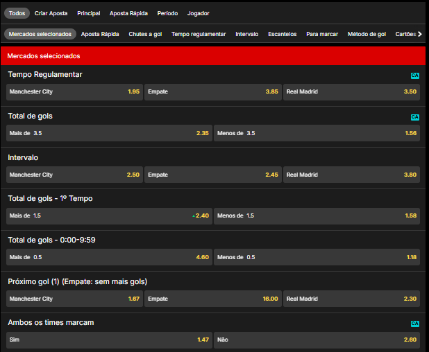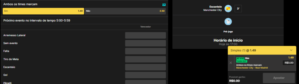 Em um confronto entre Manchester City x Real Madrid, se você aposta em Manchester City e Ambas Marcam, a aposta será vencedora se o City ganhar o jogo (por exemplo, 2×1 ou 3×2), mas perderá caso o Real Madrid não marque ou se o City não vencer.