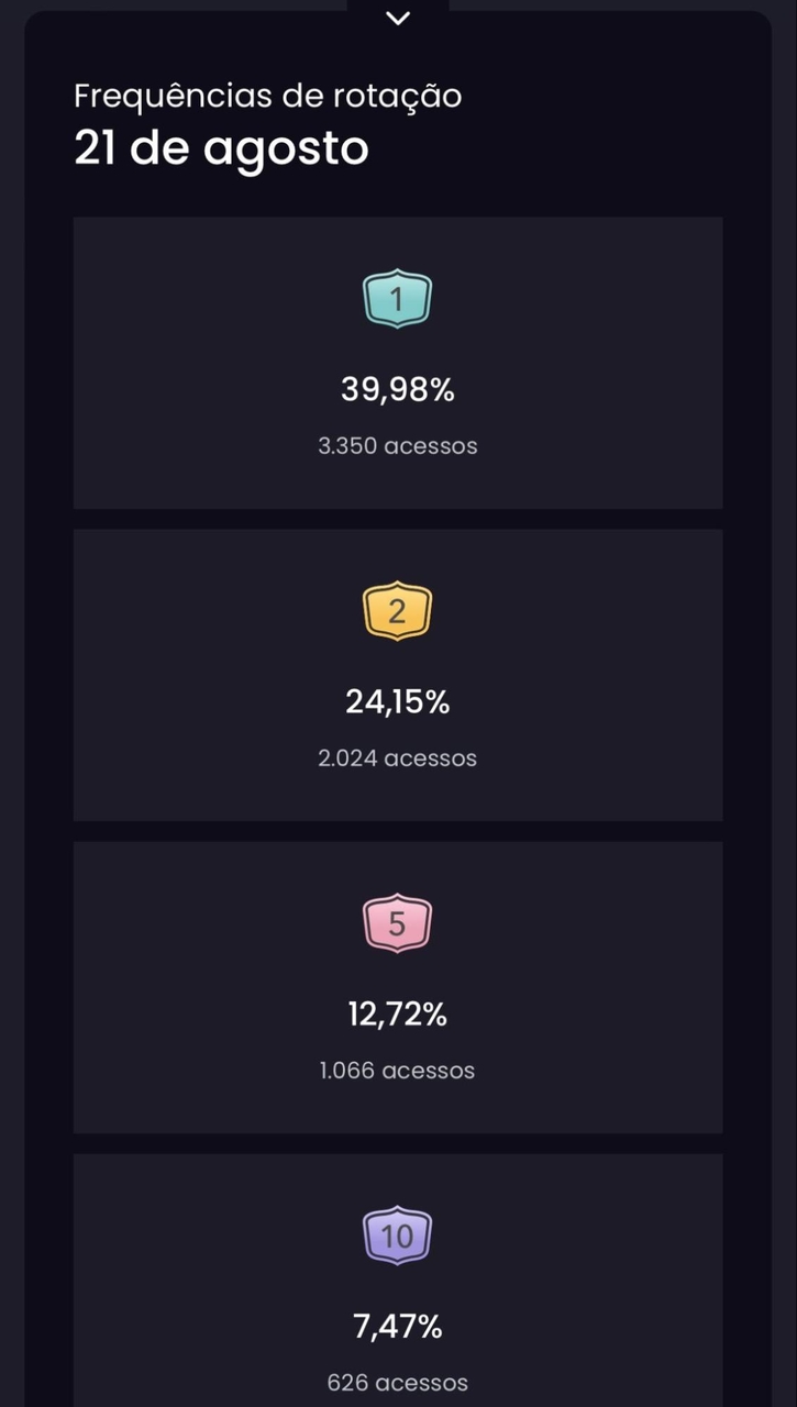 Esta estatística do Crazy Time mostra a quantidade de vezes que cada segmento da roda foi atingido em relação ao total de giros, bem como a porcentagem correspondente. No exemplo, você pode ver que o número 1 foi o segmento mais atingido no jogo no dia 21 de agosto de 2024. Também é possível ver com que frequência as rodadas de bônus foram acionadas.