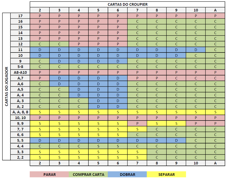 As colunas representam a carta visível do croupier, variando de 2 a Ás. As linhas indicam a mão do jogador, dividida em mãos rígidas (sem Ás), mãos suaves (com Ás), e pares.