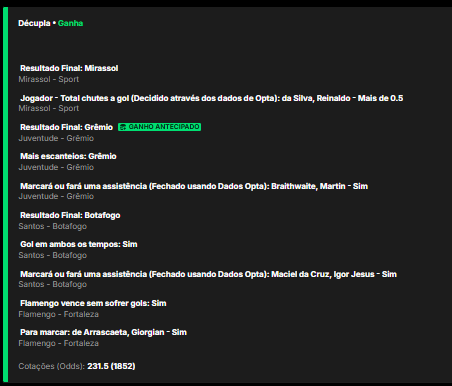 Floripa Mil Grau cravou uma aposta com 10 seleções em jogos do Campeonato Brasileiro, somando odds de 231 em uma aposta de R$ 5. Resultado preciso que rendeu mais de R$ 1 mil no bolso!