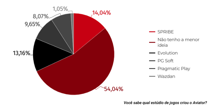 Outra curiosidade sobre o Aviator é sobre o estúdio que o criou. Se você não sabia que o Aviator foi criado pela Spribe, não se preocupe, mais da metade dos entrevistados (54%) também não faziam a menor ideia. Agora, se você sabia desta informação, parabéns! Você está entre o seleto grupo de 14% que responderam corretamente a esta pergunta em nossa pesquisa.