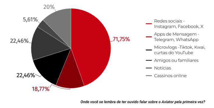 Quando perguntados onde ouviram falar do Aviator pela primeira vez, a maioria dos entrevistados mencionou as redes sociais (71,75%) ou microvlogs (22,46%) como TikTok e curtas do Youtube. Como podemos ver no gráfico abaixo, muitos também descobriram o jogo por meio de amigos e familiares (22,46%) e cassinos online (20%).