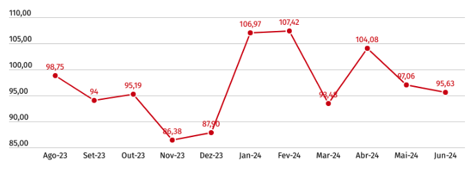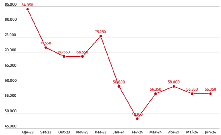 Como é possível observar, há um pico acentuado em agosto de 2023, seguido por uma queda contínua até fevereiro de 2024, onde atinge o ponto mais baixo. Posteriormente, o volume de buscas apresenta uma leve recuperação, estabilizando-se nos meses seguintes.