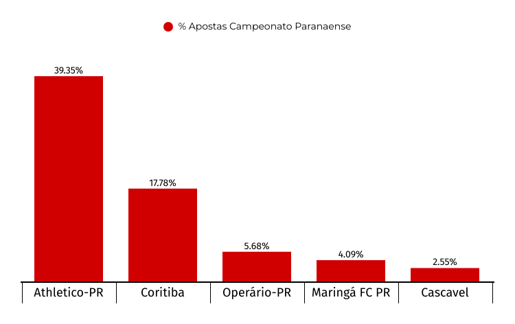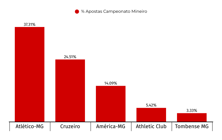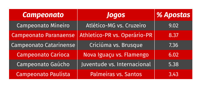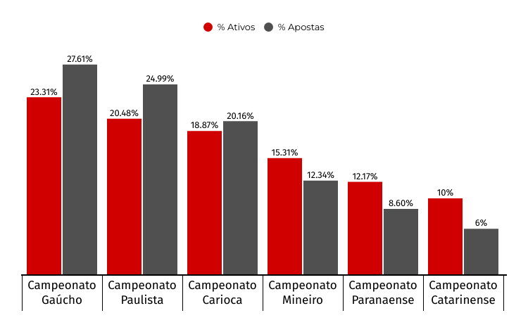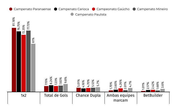 O Campeonato Mineiro corresponde a pouco mais de 12% das apostas; o Campeonato Paranaense à 8.6%; e o Campeonato Catarinense, a 6% das apostas.