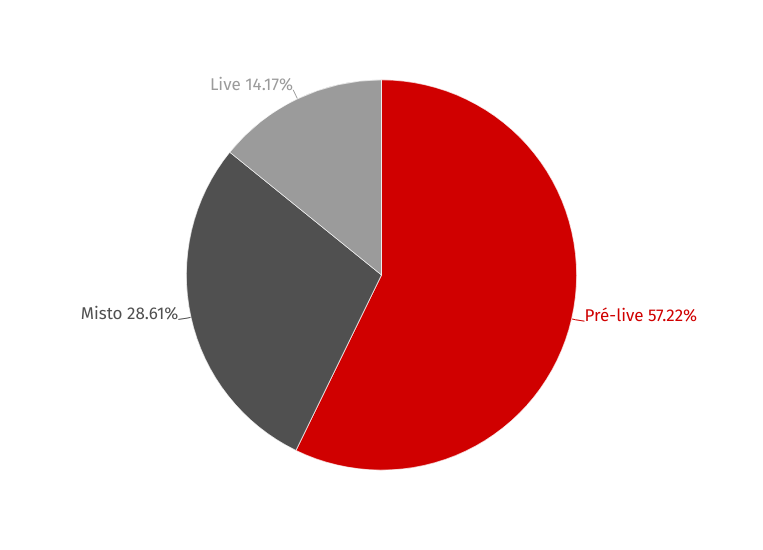 - O momento favorito de aposta dos jogadores foi o Pré-live, com pouco mais de 57% das apostas.