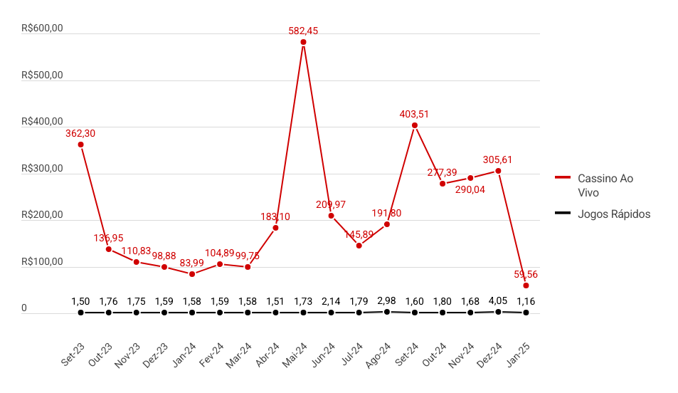Ao longo dos meses, o tamanho médio das apostas nos jogos rápidos foi de R$1,95, o que reflete um padrão de apostas menores (muitas vezes igual ao valor mínimo do jogo). Por outro lado, nos jogos de cassino ao vivo, os valores apostados foram significativamente mais altos, atingindo uma média de R$234,75 – um valor quase 120 vezes maior do que nos jogos rápidos.