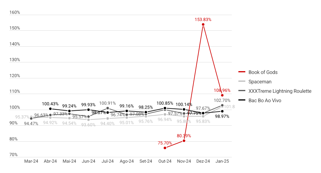 Os slots apresentaram as maiores oscilações de RTP, como observado no Book of Gods, que foi de 75.7% em outubro de 2024 para impressionantes 153.83% em dezembro, antes de estabilizar em 108.96% em janeiro de 2025.