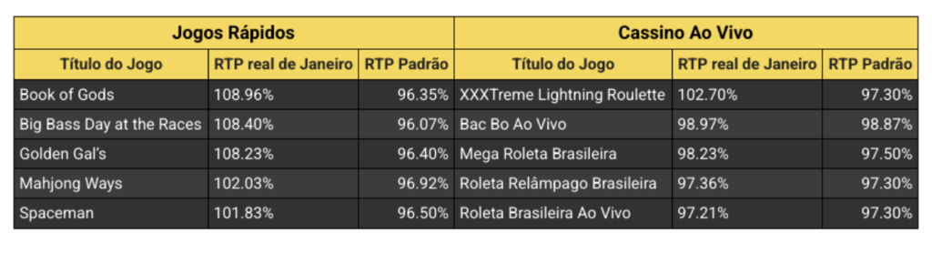 - RTP em Destaque: Apesar da RTP ter uma média mais alta nos jogos de cassino ao vivo, foram os jogos rápidos que tiveram títulos com a maior RTP em janeiro de 2025, como Book of Gods com 108.96%.