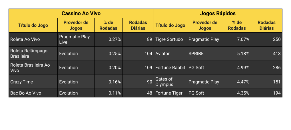 Os números evidenciam uma diferença significativa entre as modalidades. Os jogos rápidos representam uma parcela muito maior das rodadas jogadas na KTO, com títulos como Tigre Sortudo (7.07%) e Aviator (5.18%) se destacando entre os principais. Em contrapartida, no cassino ao vivo, mesmo os jogos mais populares, como Roleta Ao Vivo (0.27%) e Roleta Relâmpago Brasileira (0.25%), possuem um volume total de rodadas consideravelmente menor.