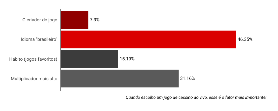 Mas, quando falamos especificamente de cassino ao vivo, o cenário muda. Mais da metade dos jogadores (56.41%) preferem jogar cassino ao vivo com dealers brasileiros e, para 46.35% dos apostadores, o idioma em português do Brasil é o fator mais importante na hora da escolha do jogo. Os multiplicadores aparecem em segundo lugar, com 31.16%, seguidos do hábito de se jogar o mesmo jogo favorito (15.19%), sem precisar pensar muito ao analisar as opções no menu.