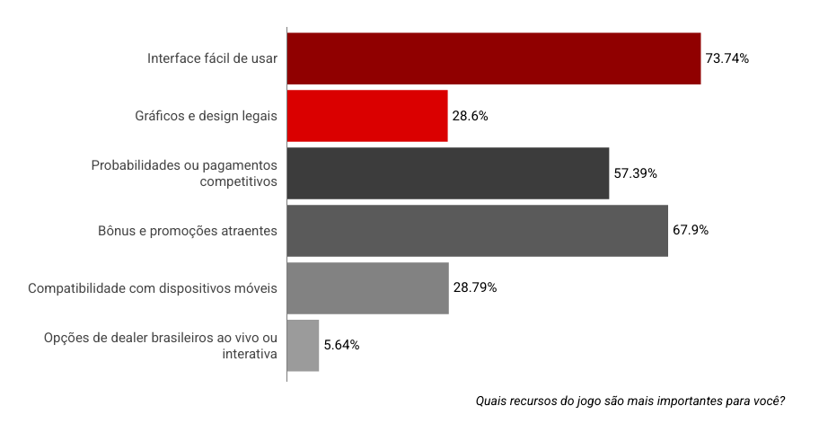 E, ao ouvirmos nossos jogadores, descobrimos que os recursos mais importantes para eles são bônus e promoções atraentes (67.9%) e uma interface fácil de usar (73.74%). Isso revela que o interesse por um jogo vai além dos números e passa por uma experiência completa.