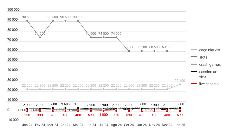 Os jogos rápidos se destacam novamente e se consolidam como a categoria com maior número de jogadores ativos. Para ilustrar essa diferença, em janeiro de 2025, eles registraram uma popularidade sete vezes maior do que os jogos de cassino ao vivo, reforçando a preferência dos apostadores por formatos mais dinâmicos.