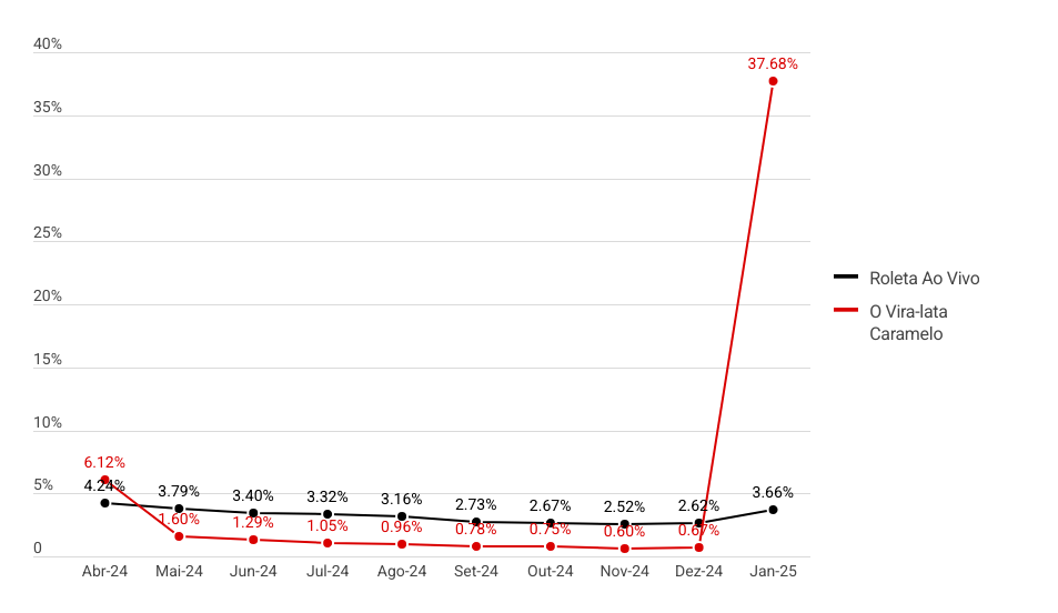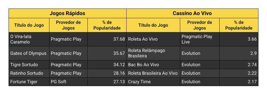 - Líder em Popularidade: Os jogos rápidos registraram 7 vezes mais jogadores ativos do que os jogos de cassino ao vivo, com destaque especial para O Vira-lata Caramelo, líder de janeiro com 37.68%.