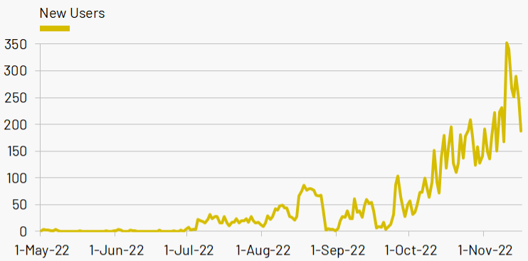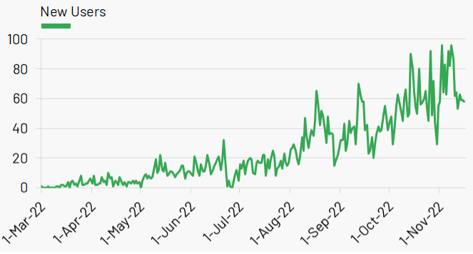 O gráfico acima mostra a quantidade de novos usuários diários na página Spaceman da KTO crescendo constantemente desde o agosto/setembro de 2022 e atingindo mais de 350 em novembro. A curva ascendente fornece uma prova adicional para a recente explosão de interesse neste gênero de jogo.