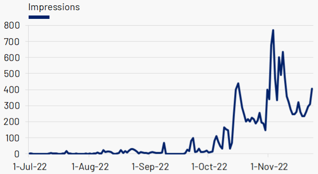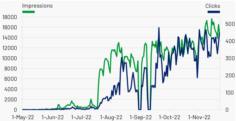 O crescimento do Spaceman também é validado pelos volumes gerais de pesquisa, inclusive por usuários que não conseguiram realmente jogá-lo. A quantidade composta de impressões e cliques nos últimos quatro meses ilustra o impacto do jogo na comunidade gamer brasileira.