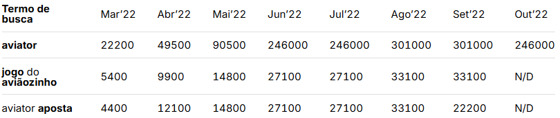 Vemos que vários termos – aviator, jogo, aviãozinho, aposta, dinheiro, ganhar, jogar, cassino – são combinados para pesquisar o jogo de cassino de sucesso de 2022. Evidentemente, os usuários respondem bem à popularidade do jogo e são muito criativos ao olhar além de seu nome específico. Simplificando, muitos já ouviram falar sobre isso e querem experimentar.