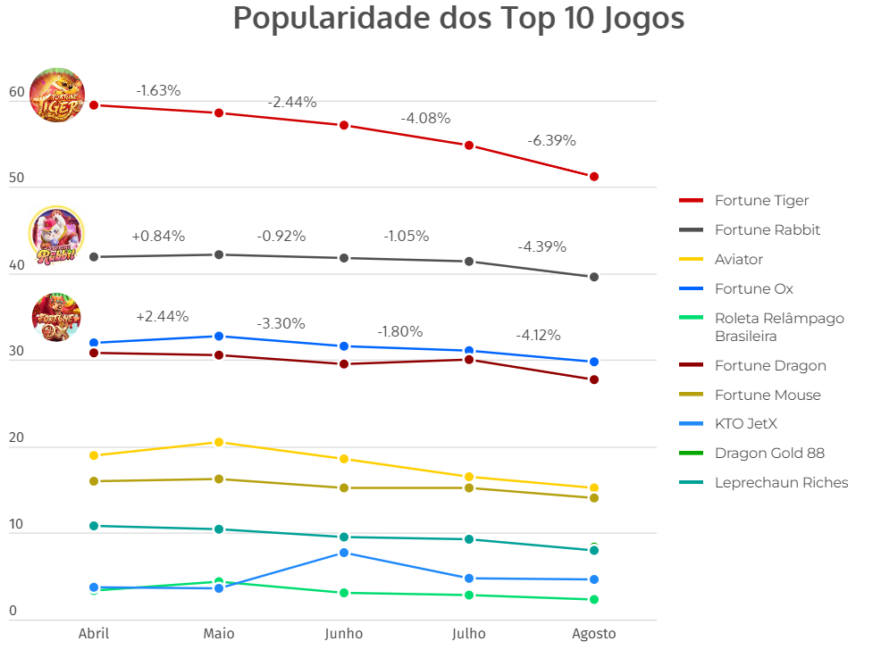 Fortune Tiger continuou sendo o jogo mais ativo em agosto, mas sofreu uma leve queda de 3,50% na popularidade em relação a julho, passando de 54,76% para 51,26%. Essa tendência de declínio já vinha sendo observada nos meses anteriores.