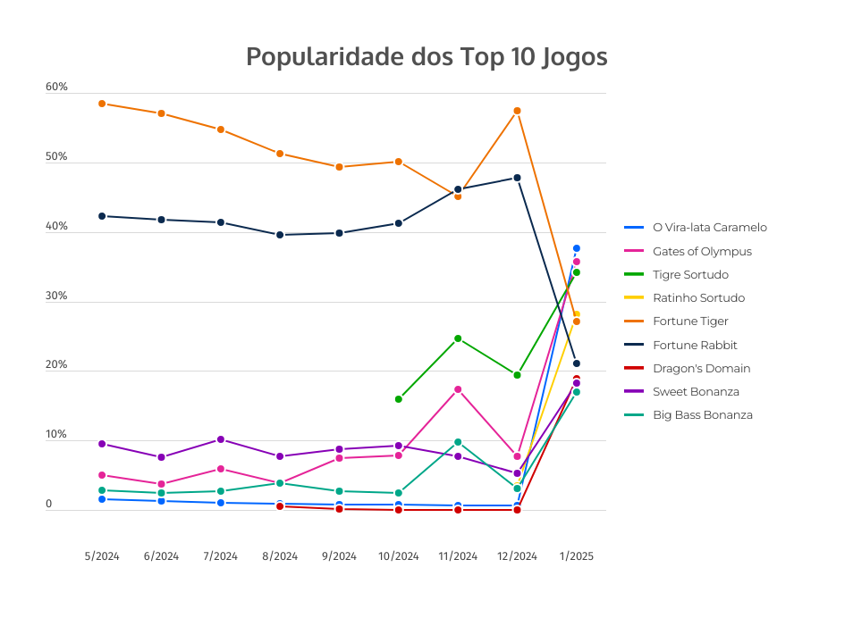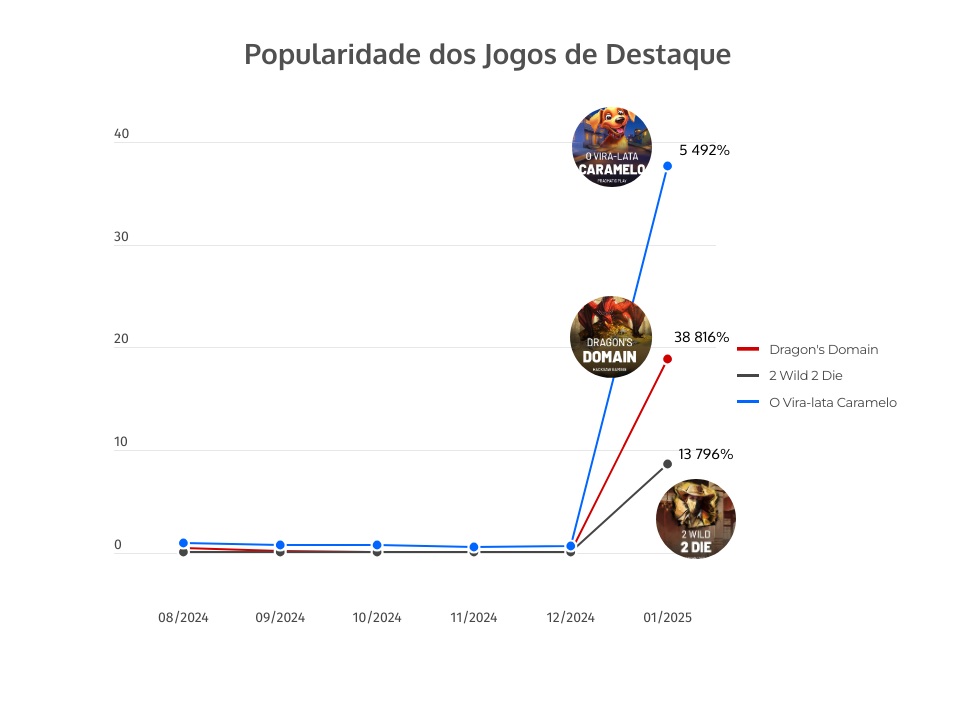 O grande destaque de janeiro foi O Vira-Lata Caramelo, que disparou de 0.67% para 37.68%. Esse crescimento meteórico consolidou o jogo como o mais popular do início de 2025, desbancando clássicos que antes dominavam o ranking.