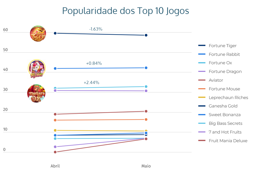 Entre abril e maio, ocorreram algumas alterações nos jogos mais jogados, refletindo as preferências dinâmicas dos jogadores: