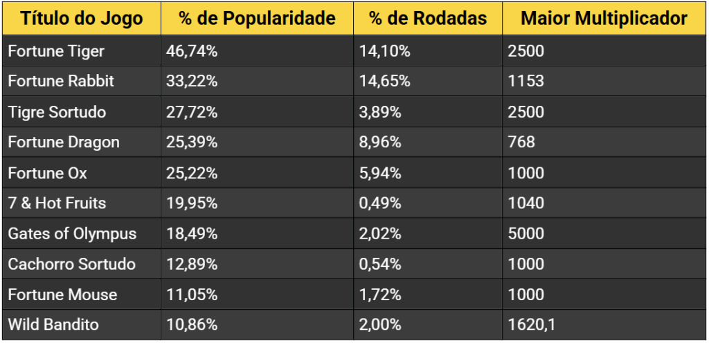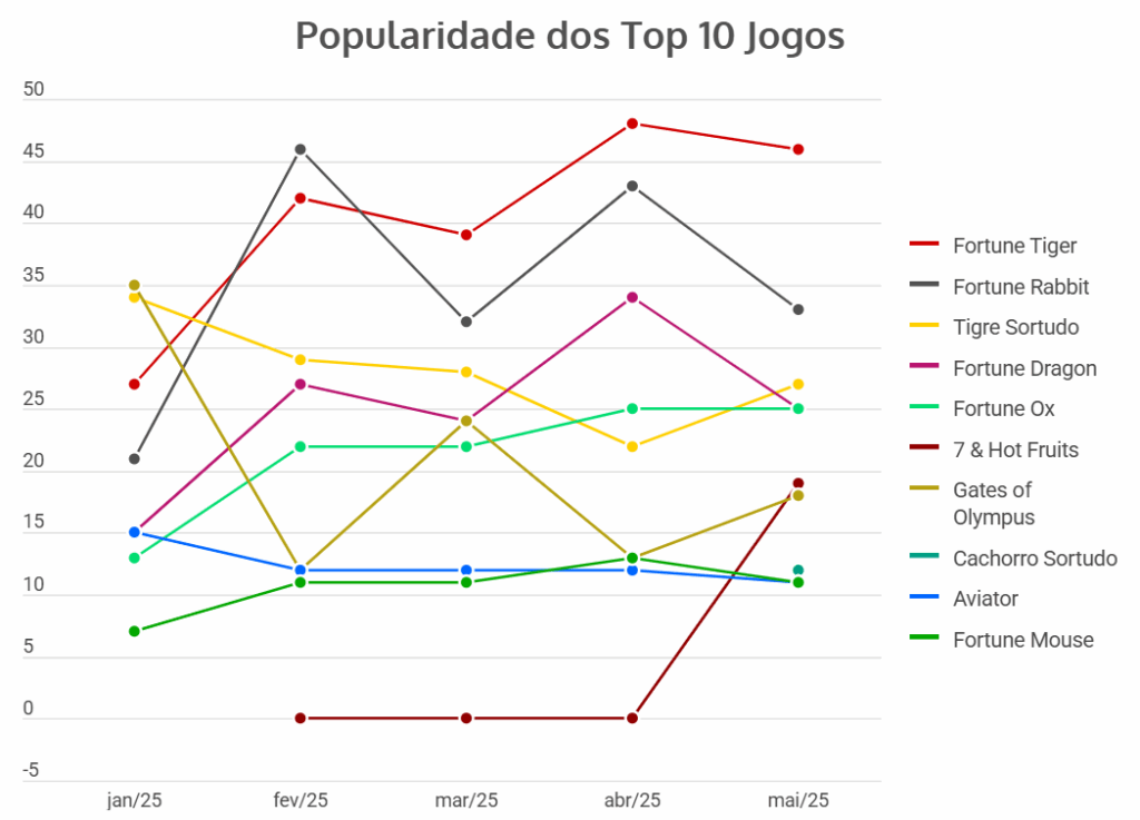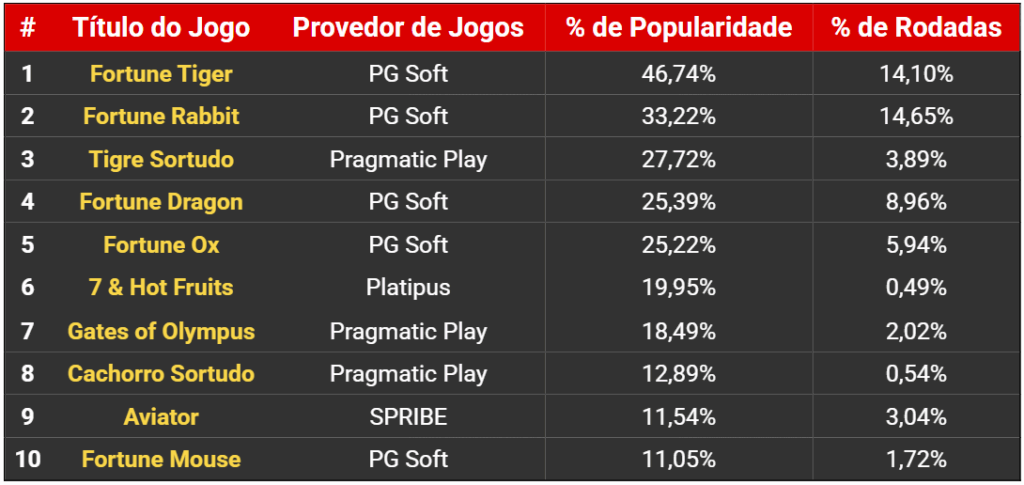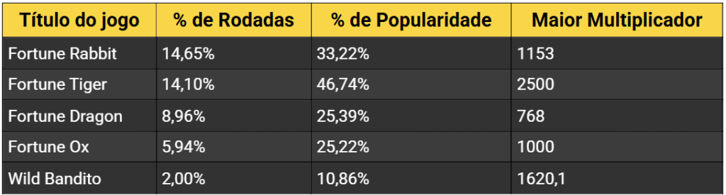 - Fortune Dragon e Fortune Ox seguiram firmes no Top 5, mantendo desempenhos sólidos tanto em popularidade quanto em rodadas jogadas.
