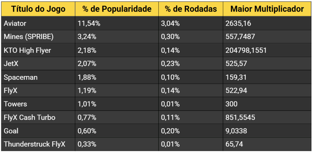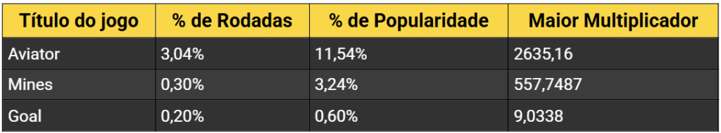 - Mines (SPRIBE) continuou entre os favoritos, com 3,24% de popularidade e um multiplicador de 557x, apesar de queda expressiva em relação ao recorde anterior.