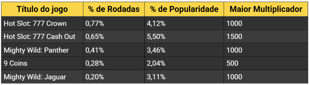 - Futebol Studio Ao Vivo entrou no Top 10 em maio com 0,61% de popularidade, enquanto Spin a Win Wild Brasileiro permaneceu entre os mais jogados, mesmo com leve queda.