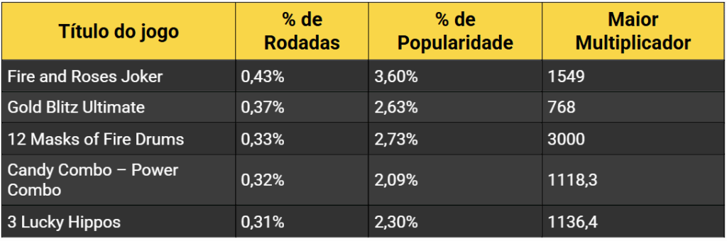 - Os jogos que saíram do Top 10 em comparação com abril foram Candy Blitz Bombs, Big Bass Return to the Races e Jeitinho Brasileiro.