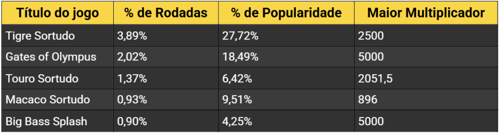 - Tigre Sortudo se recuperou e reassumiu o terceiro lugar com 27,71%, após ter caído em abril, voltando a figurar entre os três mais populares da plataforma.