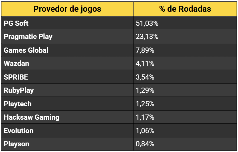 - Fortune Rabbit permanece na segunda posição, com 33,22%, além de liderar novamente em número de rodadas jogadas, refletindo seu altíssimo nível de engajamento.