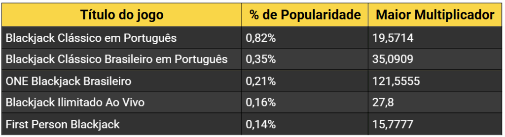 - Blackjack Clássico em Português manteve a liderança entre as mesas de blackjack com 0,82% de popularidade e um multiplicador técnico de 19,57x.