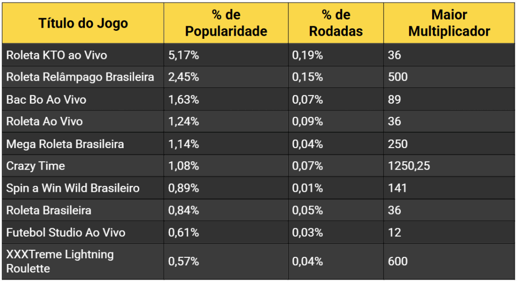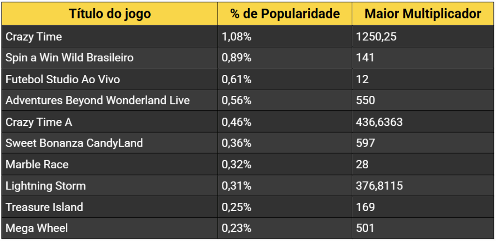 - Futebol Studio Ao Vivo apareceu como destaque entre os mais jogados, ocupando a terceira colocação com 0,61% de popularidade, embora com um multiplicador modesto de 12x.