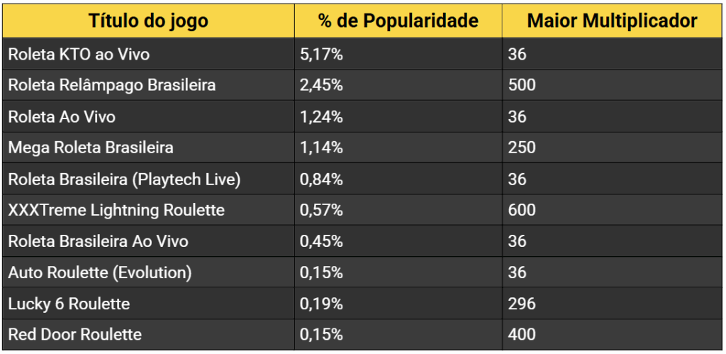 - Roleta Brasileira Ao Vivo subiu para a segunda posição, com 0,45% de popularidade e multiplicador fixo de 36x.
