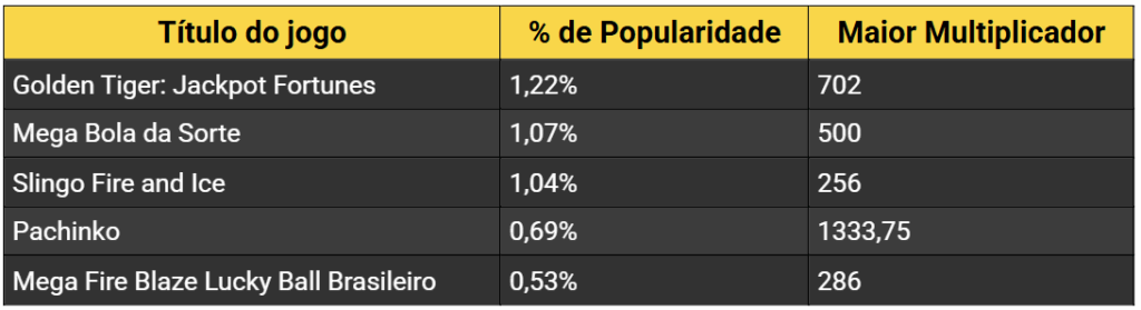 - Pachinko apareceu como novidade na vertical de bingo, com 0,69% de popularidade e o maior multiplicador da lista, com 1333,75x.