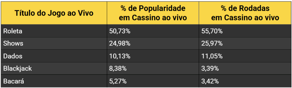 E se olharmos apenas para o cassino ao vivo, veremos que mesas de roleta e game shows têm mais fãs.