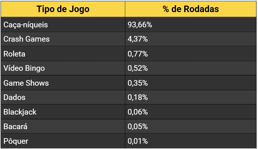 Os crash games tiveram uma pequena queda, passando de 5,13% para 4,37%, mas seguem como a segunda categoria mais popular.