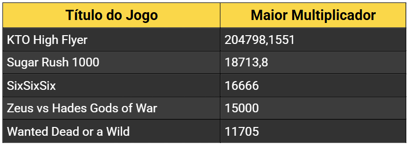 - KTO High Flyer foi o grande destaque técnico do mês, alcançando um impressionante multiplicador de 204.798x, muito acima de todos os demais jogos do ranking.