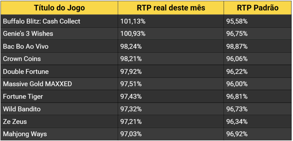 Aqui está uma lista de jogos com a maior RTP real deste mês que você não vai querer perder, em comparação com as RTPs padrão destes mesmos jogos: