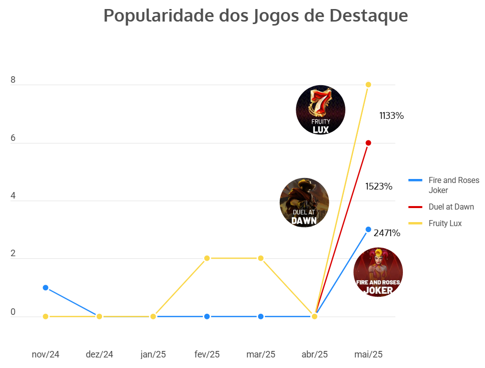 - Dois jogos entraram no Top 10 em maio: 7 & Hot Fruits e Cachorro Sortudo passaram a figurar entre os mais populares, destacando-se entre os destaques técnicos e novos favoritos dos jogadores.