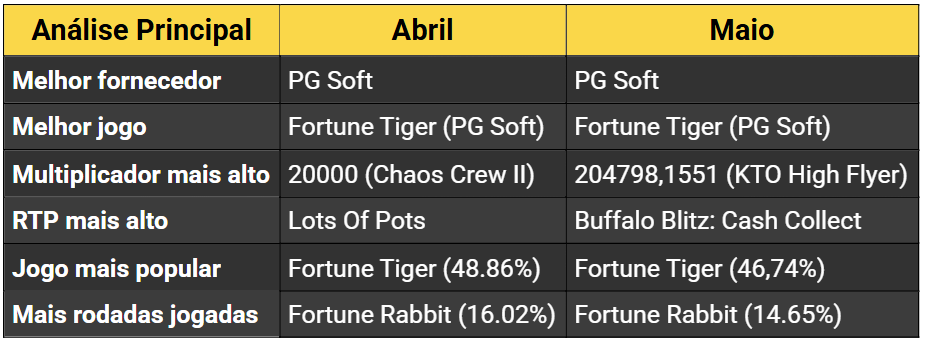 - Tigre Sortudo se recuperou da queda de abril e voltou ao Top 3 com 27,71% de popularidade, igualando Fortune Tiger no maior multiplicador do mês: 2500x.
