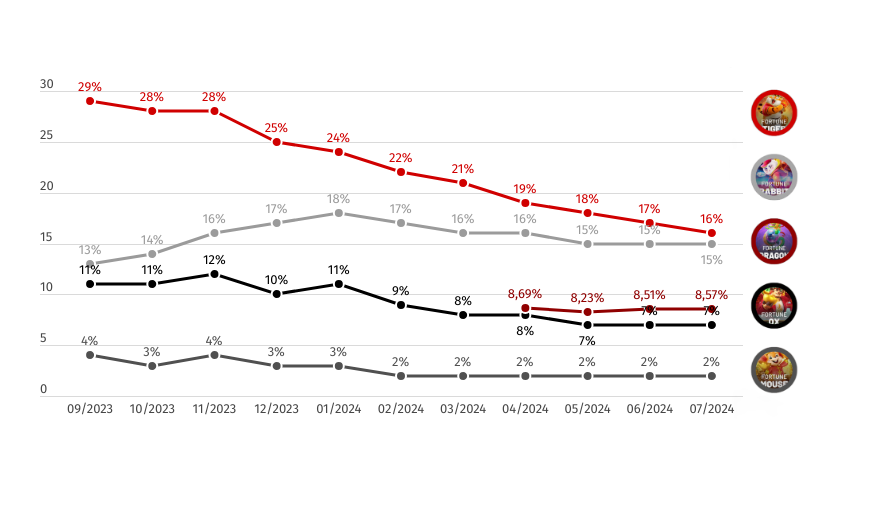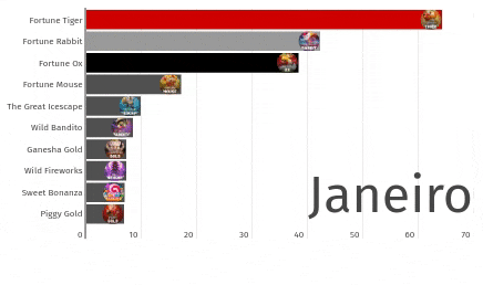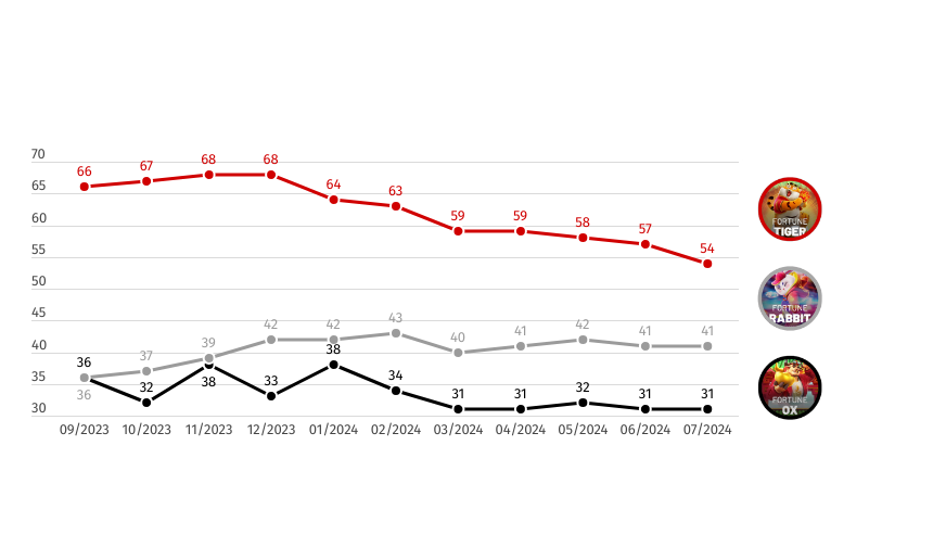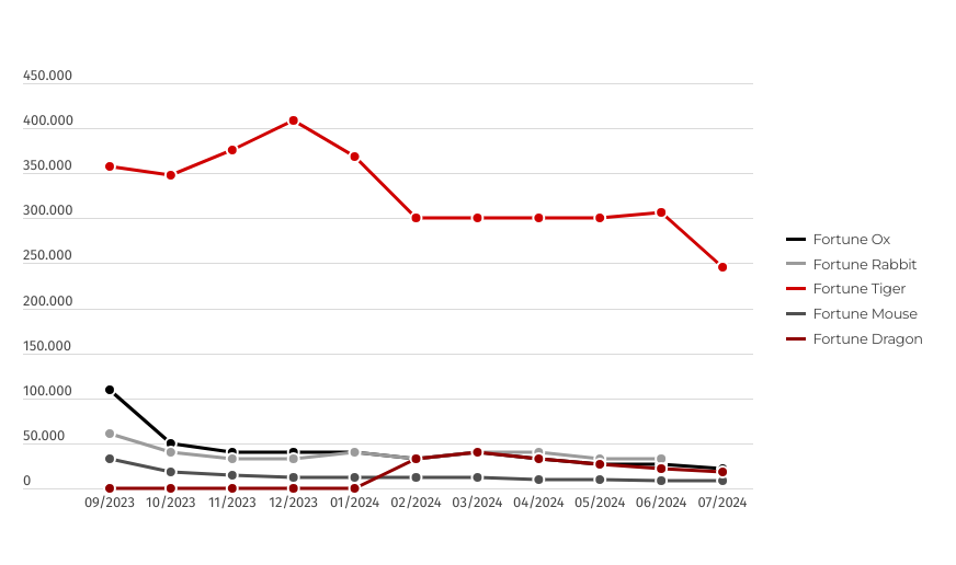 Conforme ilustrado no gráfico acima, o Fortune Tiger é, sem dúvida, o líder de popularidade, seguido pelo Fortune Rabbit e Fortune Ox – que demonstram, entre si, uma competição um pouco mais acirrada até janeiro de 2024.