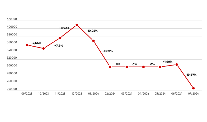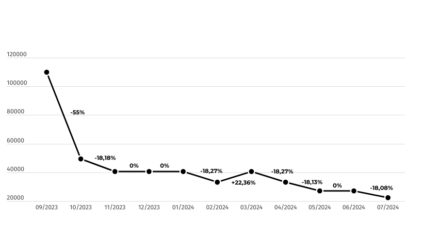 Para se ter uma ideia, se compararmos o ponto mais alto, em setembro de 2023, com o ponto mais baixo, em julho de 2024, temos uma queda de aproximadamente 80% no volume de buscas.